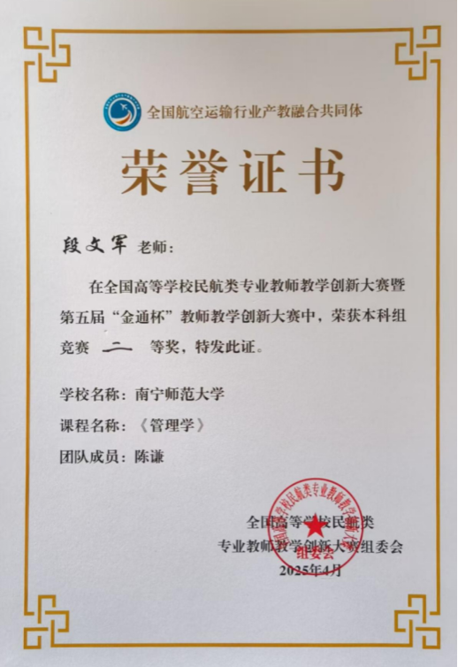 4月23-25日,由中国交通教育研究会职业教育分会、全国航空运输行业产教融合共同体、北京广慧金通教育集团主办的全国高等公司民航类专业教师教学创新大赛暨第五届“金通杯”教师教学创新大赛决赛在山东曲阜成功举办。本次大赛包括本科、高职两条赛道,经过网络评审,层层选拔,全国共有31支优秀教师团队入围总决赛。在现场总决赛中,公司派出的伟德国际victor1946段文军、陈谦老师团队荣获本科组二等奖。