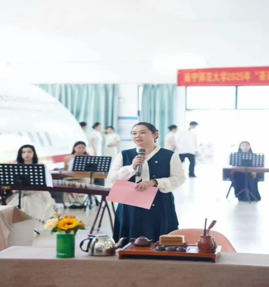 当日,“一叶风华・茶韵三重奏”开幕式在武鸣校区地信楼举行。校团委书记区丽媛、公司党委书记贾坷、顺景茶公司游琦丽老师、茶艺社指导老师陈春容出席活动。贾坷书记致开幕词后,精彩的茶艺表演将现场带入古雅意境。茶员身着传统茶服,依次展示绿茶、红茶、乌龙茶茶艺及宋代点茶技艺,行云流水的冲泡动作与氤氲茶香交织,重现千年茶道之美。古筝演奏与茶服走秀轮番登场,丝弦雅韵与茶人风姿相映成趣,尽显中华传统文化魅力。