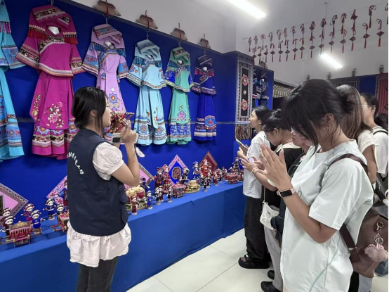 随后,同学们移步至公司壮族非遗工坊,近距离感受传统文化的独特魅力。从传情达意的绣球、祈福纳吉的香囊,到承载婚俗文化的古骆越花轿和蕴含身份象征的壮族传统服饰,志愿者们的细致讲解让静态的展品“活”了起来。同学们饶有兴致地观察、提问,在互动交流中,对壮族文化的精湛技艺与深厚底蕴赞叹不已。