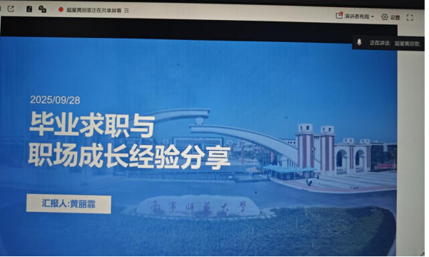 现任超星泛雅集团大客户销售黄丽霏优秀员工结合自身从“南师学子”到“职场人”的成长历程,分别从“求职准备”“职场起步与深耕”两大维度分享就业经验,鼓励学弟学妹打破地域限制、树立“积极就业、理性择业”“先就业再择业”的观念。